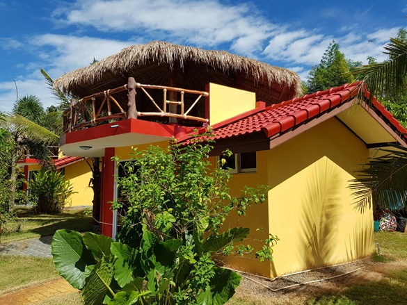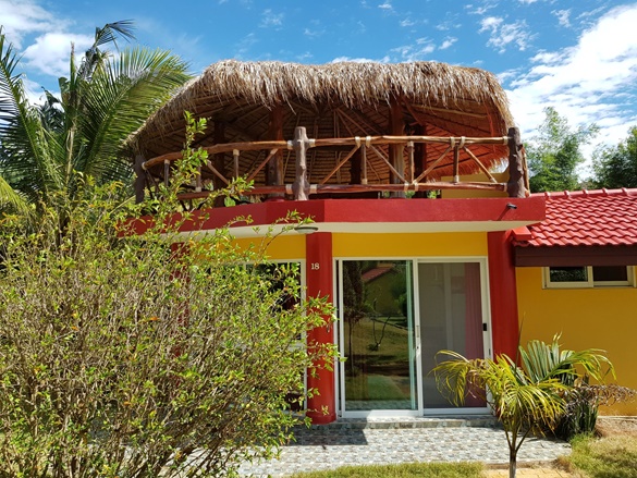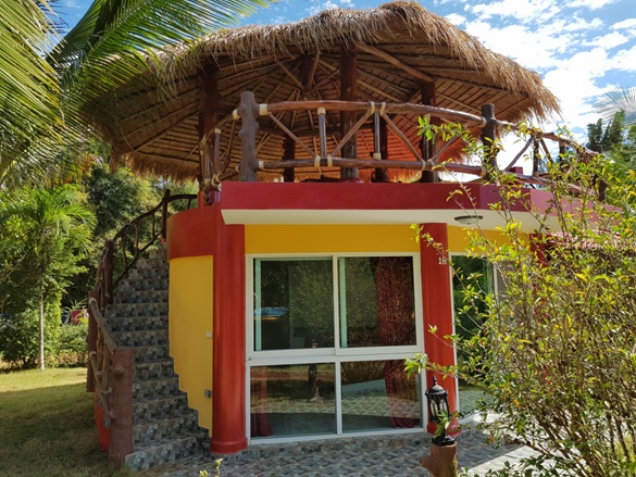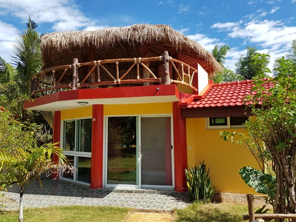 Einer der 6 Bungalows mit Doppelbett und privater Dachterrasse. Mit Blick auf den Pool- und Strandbereich.
