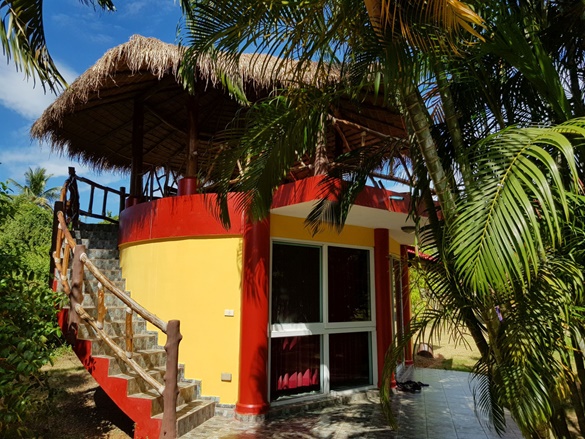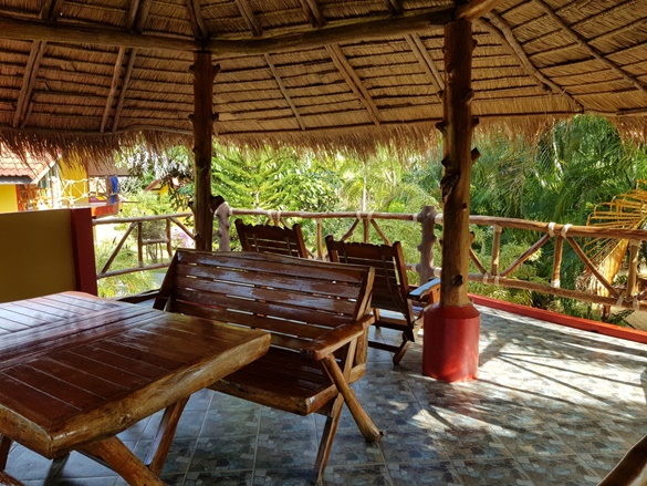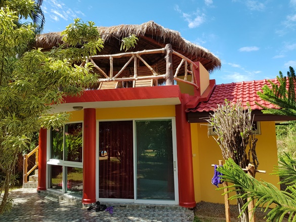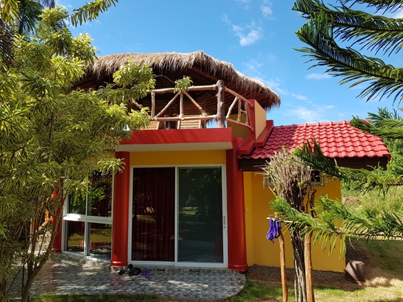 One of the 6 bungalows with double bed and private rooftop terrace. With view onto the pool.